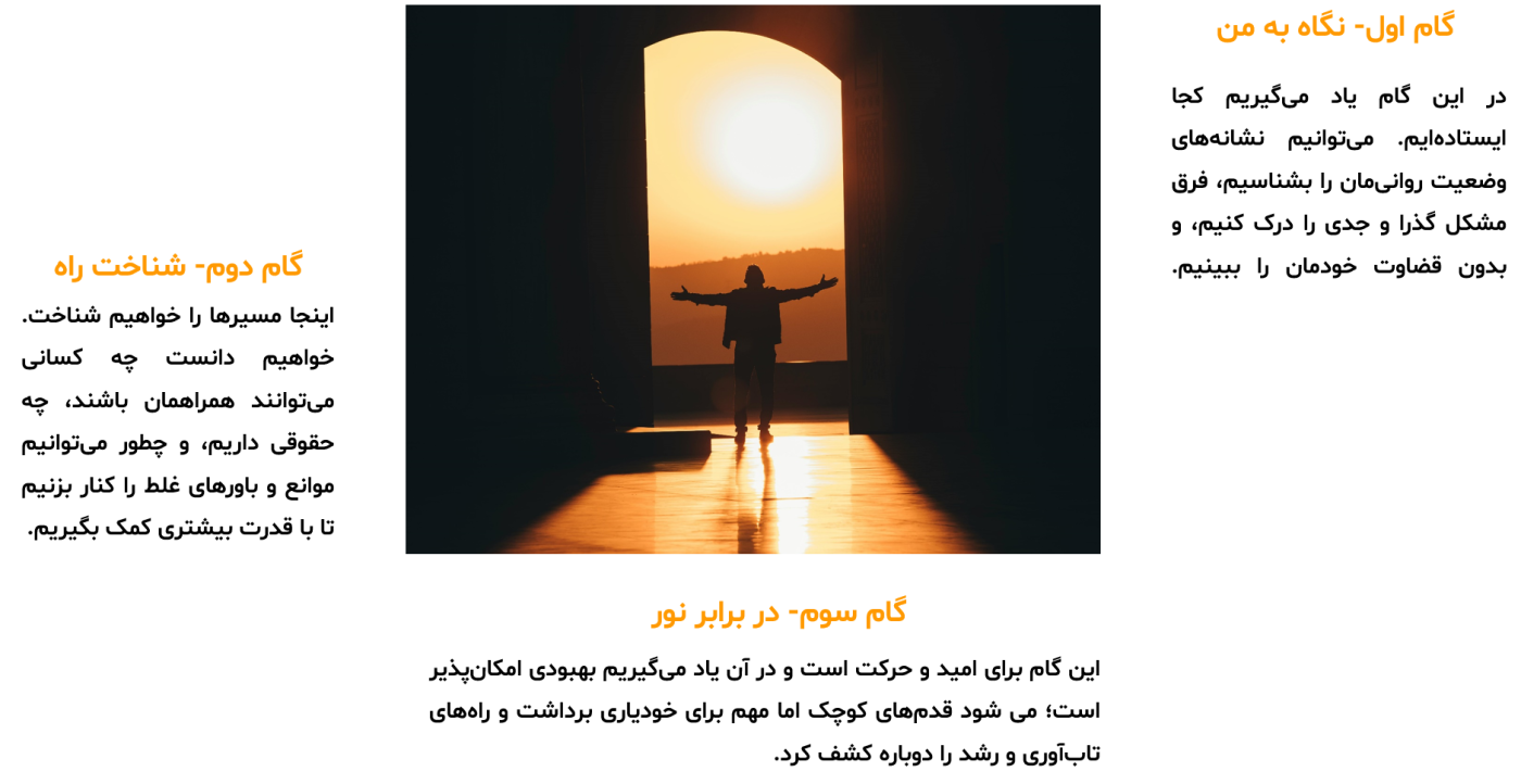 وضوح، نخستین شرط همراهی است. هر کدام از سه گام دالان یک هدف روشن دارد. وقتی که بدانیم به سوی چه آگاهیای قدم برمیداریم، مسیر پیشِ رو معنا پیدا میکند، اضطراب کمرنگ و قدمهایمان استوارتر می شود.
